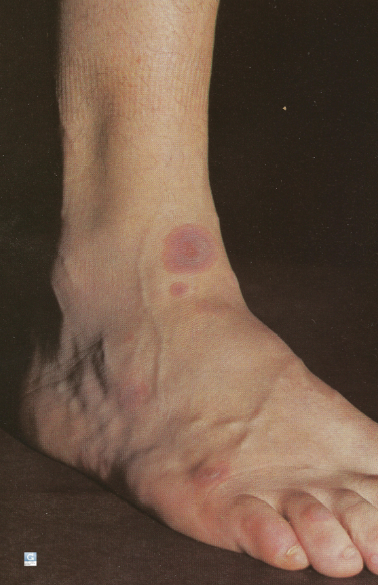 Esta erupção geralmente se assemelha a uma roseta (ou alvo) e muitas vezes atinge o tronco e os braços.